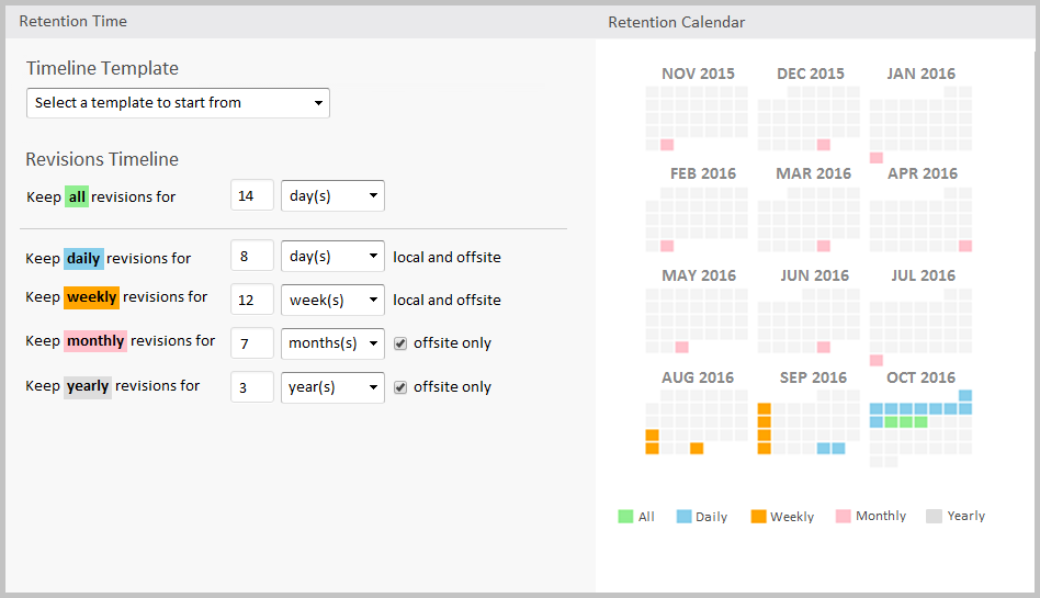 Você pode definir o período de tempo para manter os backups em seu armazenamento local, armazenamento externo ou ambos para um equilíbrio perfeito entre proteção de dados e requisitos de armazenamento.
